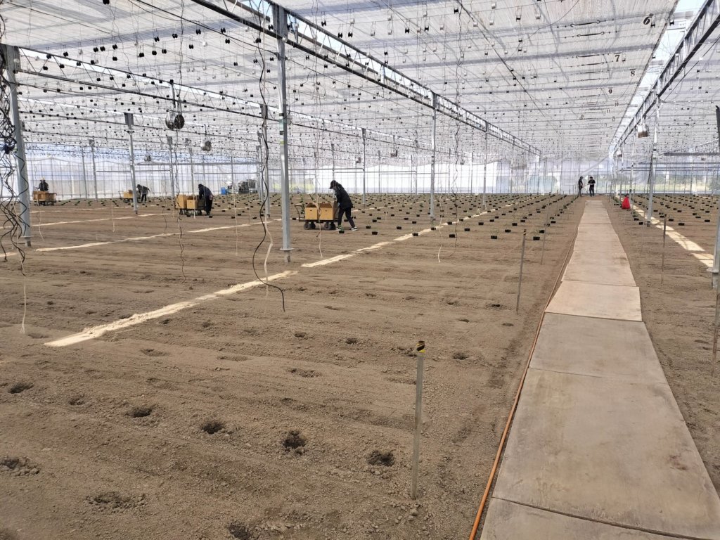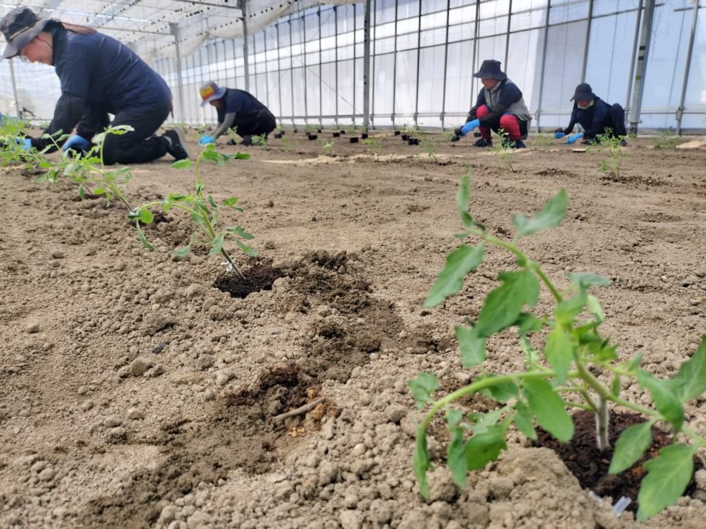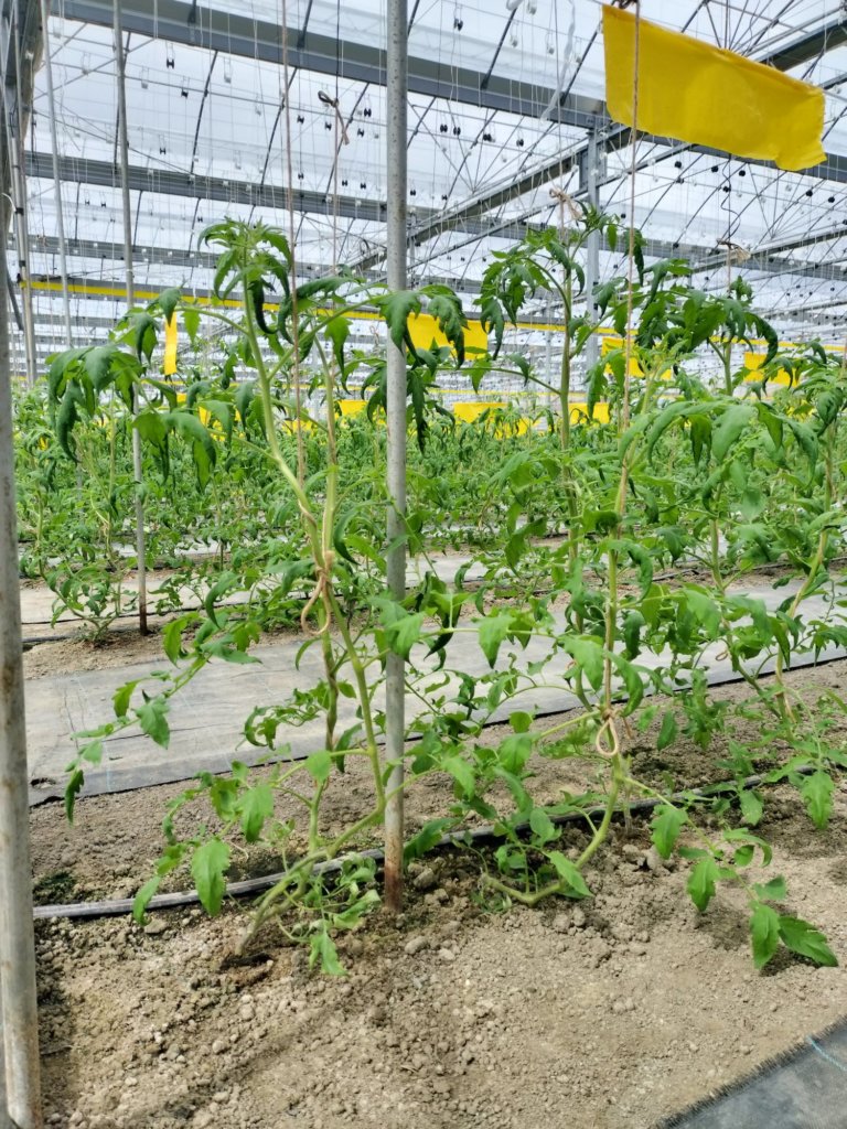 お盆明けから定植準備が始まり、猛暑の中(ビニールハウスの中は40度近くの気温のため休憩をこまめにとりながら)土壌還元消毒のシートをはがし、元被散布、トラクターで耕し、鎮圧、定植穴の印をつけて穴あけ、灌水チューブ設置等を行った後、8月27日にBのトマトハウスに3520苗、9月4日Aのトマトハウスに1840苗を植えました。