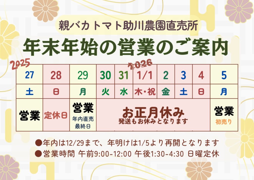 また年内のトマト販売・発送は12月29日(金)までとなっております。12月30日〜1月4日まではお休みとなりますので、どうぞよろしくお願い致します。