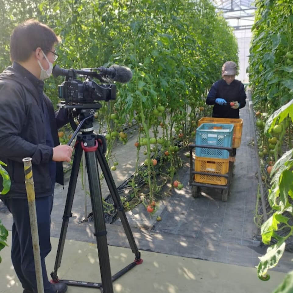 取材の当日1月20日の10時頃、カメラマンの方が来園され、スタッフがトマト収穫をしている所を撮影したり、収穫をしつつ、現在のトマトについてインタビューを受けたり、直売所にてトマトの映像を撮ったりと約1時間かけて撮影をしていただきました。