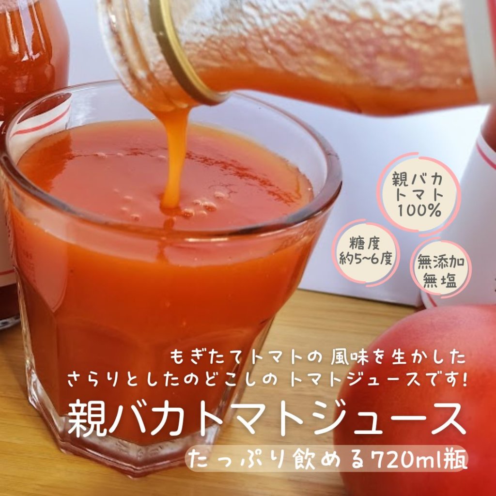 親バカトマトジュース720ml×1本、Mサイズのトマト4個、ミニトマト500gの詰め合わせです。