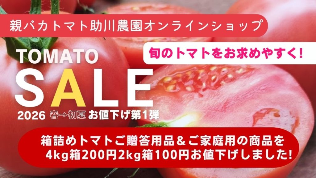 ![親バカトマトジュース(180ml 24本セット)[トマト100% 無塩・無添加] 税込8360円](https://suketoma.com/wp/wp-content/uploads/2023/08/6798e13edf1bb0982755f613b0da3b4c-640x360.jpg)